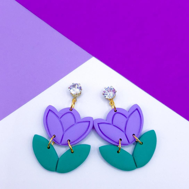 These Purple Tulip Dangle earrings are handmade using my favourite polymer clay and attached to stainless steel studs, set with a CZ gemstone.